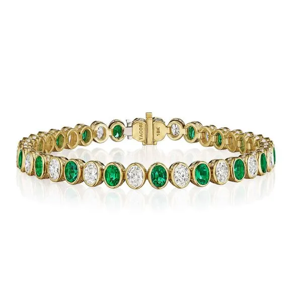 Bezel-Set Emerald & Diamond Tennis Bracelet in 18kt Yellow Gold Your Jewelry Box Altoona, PA